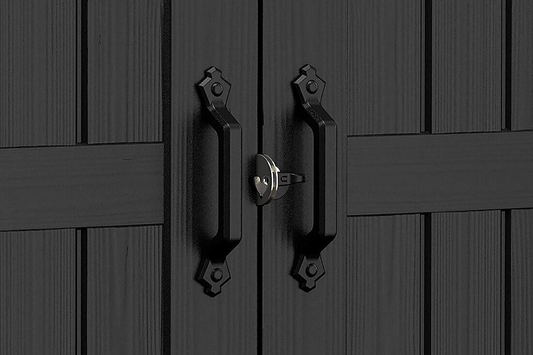 Dvere vybavené otvorom na visiaci zámok chránia interiér pred neoprávneným prístupom – pohodlné a funkčné riešenie na uloženie cenného náradia alebo záhradného vybavenia.