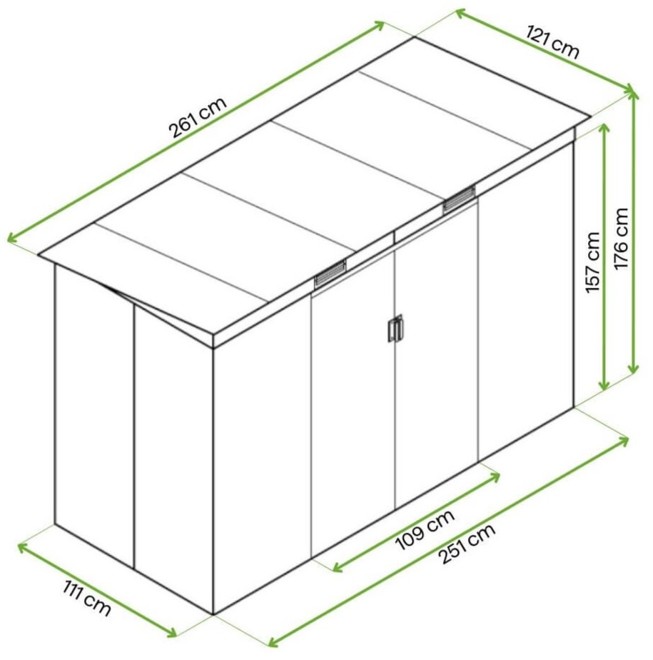 OREGON Hardmaister s rozmermi 261x121 cm je praktický domček na náradie vyrobený z pozinkovanej ocele odolnej voči korózii. Posuvné dvere a ventilačný systém chránia interiér pred vlhkosťou, zatiaľ čo možnosť namontovať visiaci zámok zvyšuje úroveň ochrany uložených predmetov.