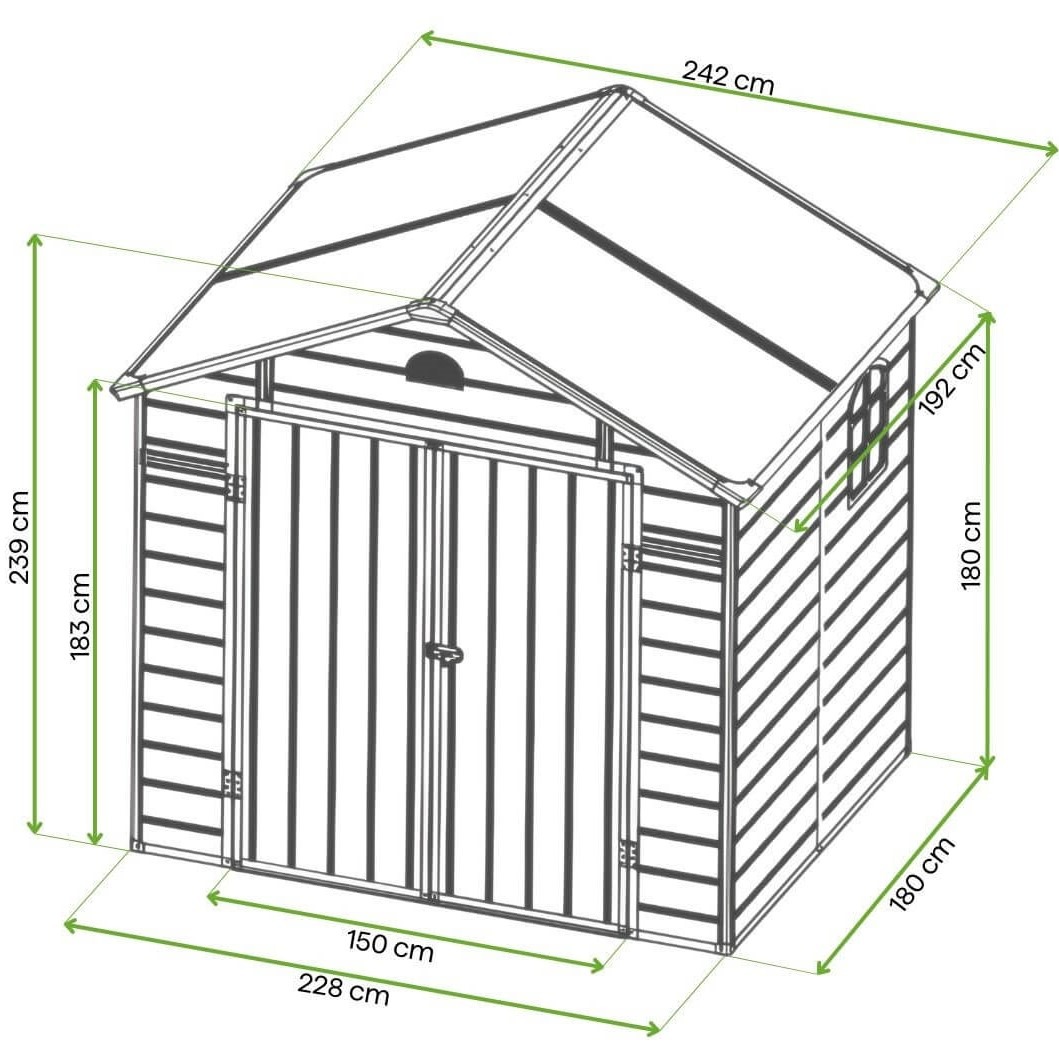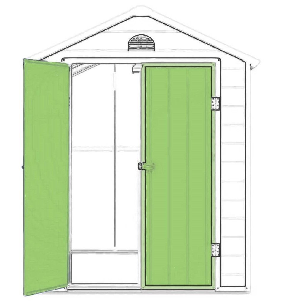 Chatka VERMONT je vybavená širokými dvojitými dverami, ktoré uľahčujú prístup do interiéru bez ohľadu na veľkosť uložených predmetov. Zámok so závorou ponúka možnosť namontovať visiaci zámok (nie je súčasťou dodávky) pre zvýšenie ochrany.