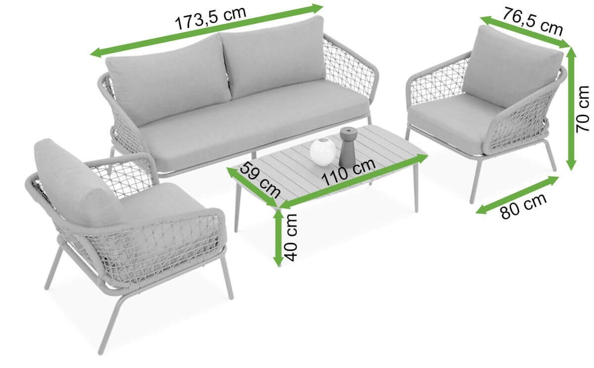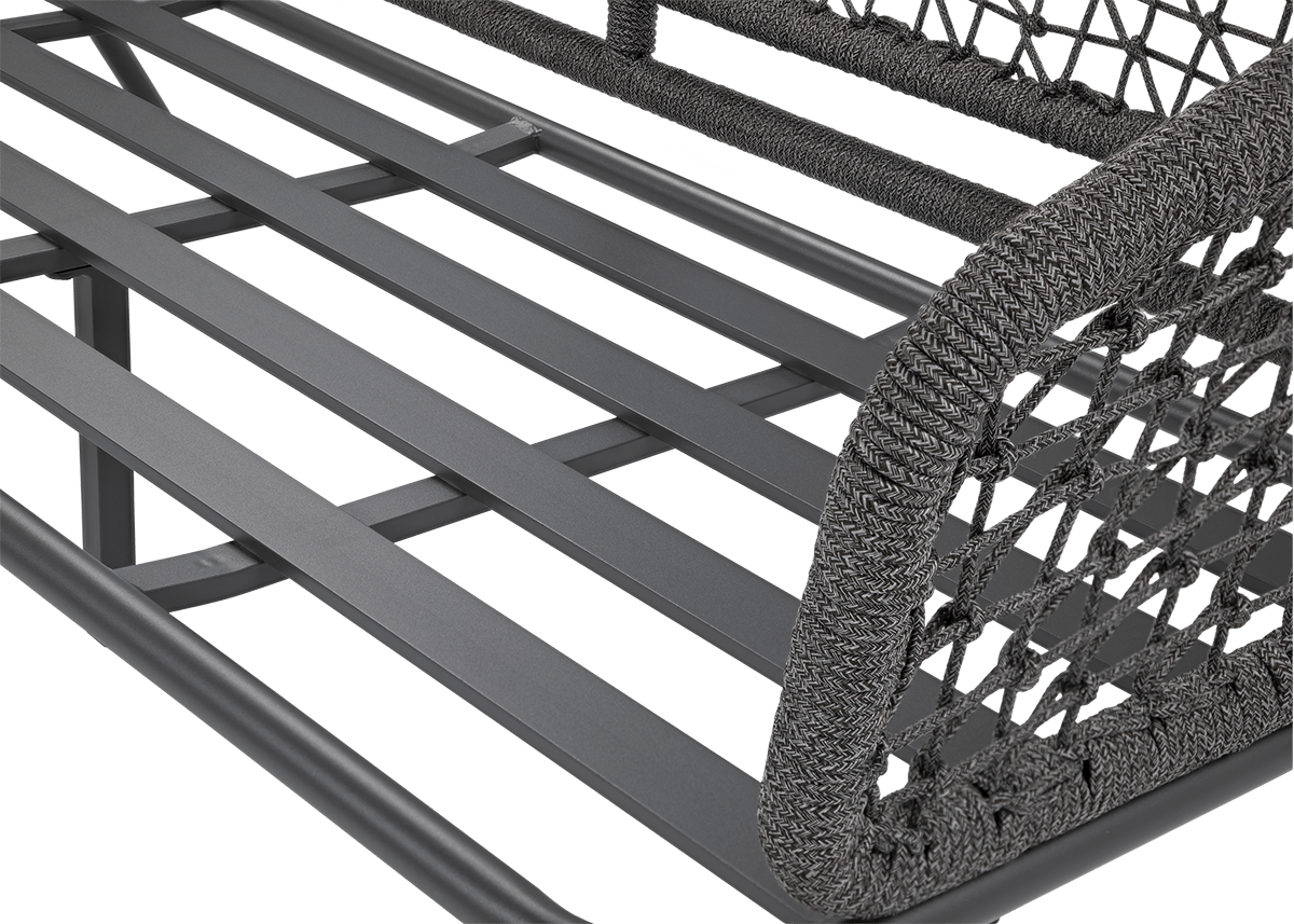 Konštrukcia nábytku je založená na pevnom, práškovo lakovanom hliníku, ktorý je odolný voči korózii a poveternostným podmienkam. Celá súprava bola ovinutá ozdobnou šnúrou, ktorá dodáva nábytku jedinečný vzhľad a ešte viac posilňuje jeho odolnosť. Je kombináciou moderného dizajnu a spoľahlivej odolnosti. Vďaka tejto konštrukcii je súprava ideálna na mnoho sezón v záhrade.