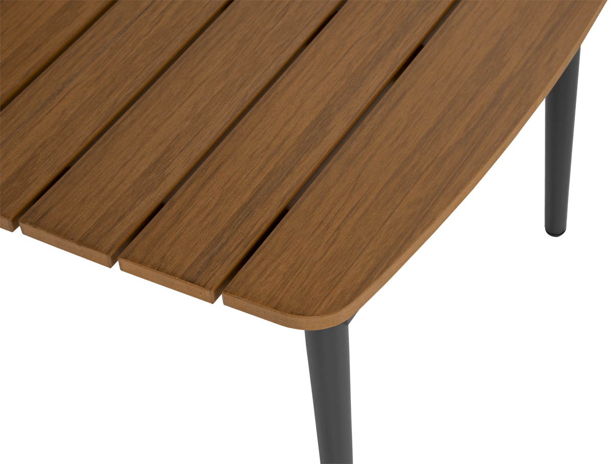 Stôl, ktorý je súčasťou súpravy, je vybavený vrchnou doskou z polywoodového dreva, ktoré dokonale imituje prírodné drevo a je odolné voči vlhkosti a UV žiareniu. S hrúbkou 1,5 cm pôsobí stolová doska pevne a elegantne. Materiál si nevyžaduje žiadnu špeciálnu starostlivosť - ľahko sa čistí a udržiava v bezchybnom stave. Je praktickým a estetickým prvkom, ktorý dotvára celý set.