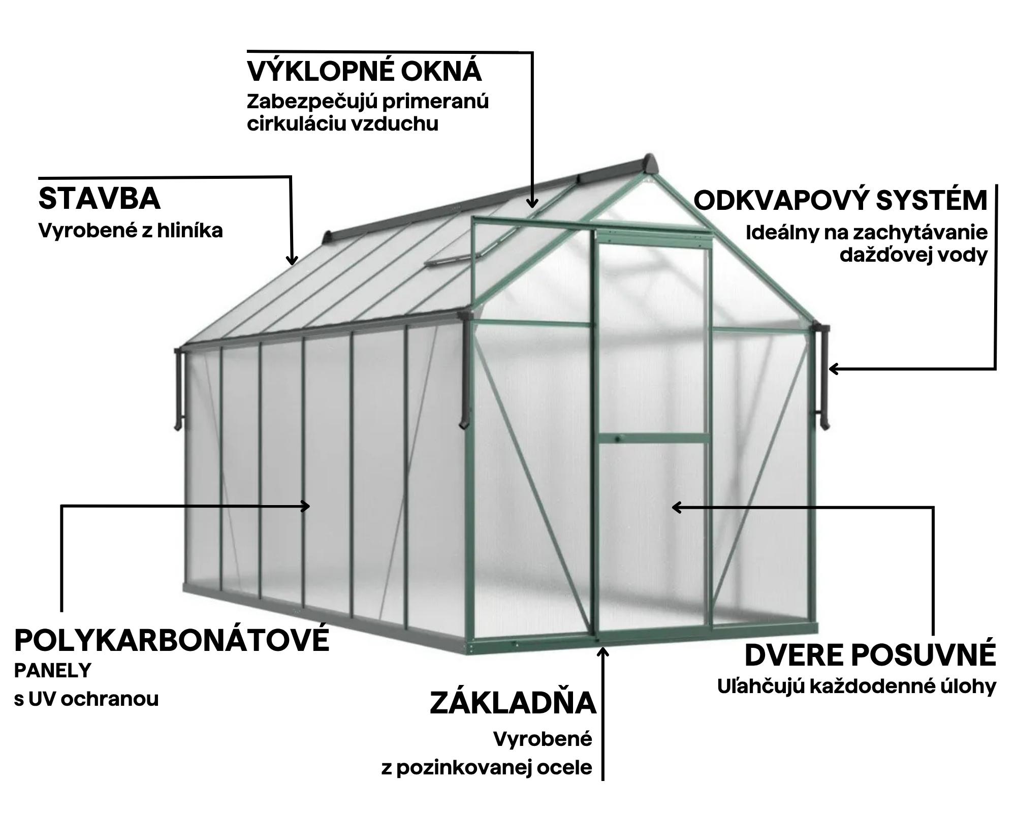 Polykarbonátové panely 4 mm s dodatočnou ochrannou fóliou vytvárajú účinnú tepelnú bariéru, ktorá zaručuje rastlinám optimálne mikroklíma aj v chladnejších dňoch. Pridaná bola aj UV ochrana, ktorá chráni rastliny pred nadmerným slnečným žiarením.