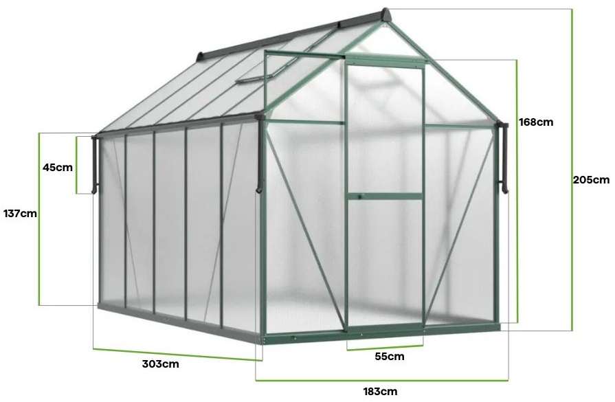 Polykarbonátový záhradný skleník Slide-In NEW 183x303cm Dark Green od Cultivo s vystuženou konštrukciou kombinuje klasický štýl s modernou funkčnosťou. Tmavozelená konštrukcia dokonale zapadá do prírodného prostredia záhrady a vytvára harmonický priestor na pestovanie rastlín. S dĺžkou 303 cm ponúka skleník ešte viac priestoru, ideálny na pestovanie zeleniny, ovocia, byliniek alebo kvetín. Polykarbonátové panely s hrúbkou 4 mm s UV ochranou poskytujú rastlinám optimálne podmienky na rast, účinne rozptyľujú slnečné žiarenie a chránia pred nadmerným teplom. Stabilný hliníkový rám a pozinkovaná oceľová základňa zaručujú robustnosť a odolnosť voči meniacim sa poveternostným podmienkam. Montáž je rýchla a jednoduchá vďaka inovatívnemu systému Slide-In, ktorý eliminuje potrebu spôn, čím zaisťuje väčšiu stabilitu a jednoduchosť použitia. Dve vetracie okná a posuvné dvere zaručujú pohodlný prístup a efektívne vetranie, čo vám umožňuje vytvoriť perfektné mikroklíma pre vaše plodiny. Polykarbonátový skleník dokonale doplní každú záhradu a dodá jej jedinečný charakter.