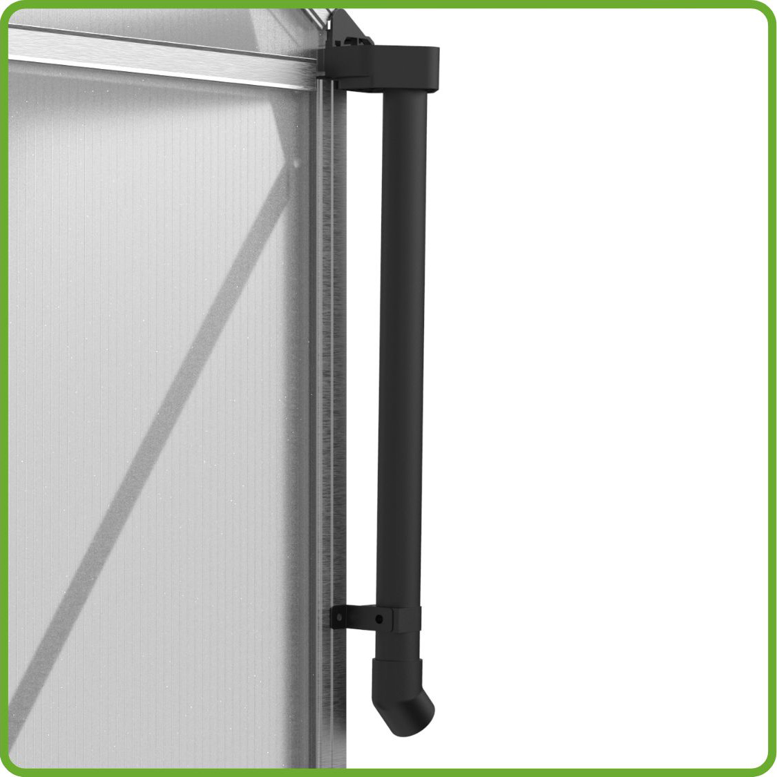 Ukośne poprzeczki boczne to gwarancja maksymalnej sztywności szklarni. Wykonane z twardszej stali malowanej proszkowo, nie tylko zapewniają długotrwałą trwałość konstrukcji, ale też idealnie komponują się z kolorem ościeżnicy, podnosząc estetykę Twojej szklarni poliwęglanowej.