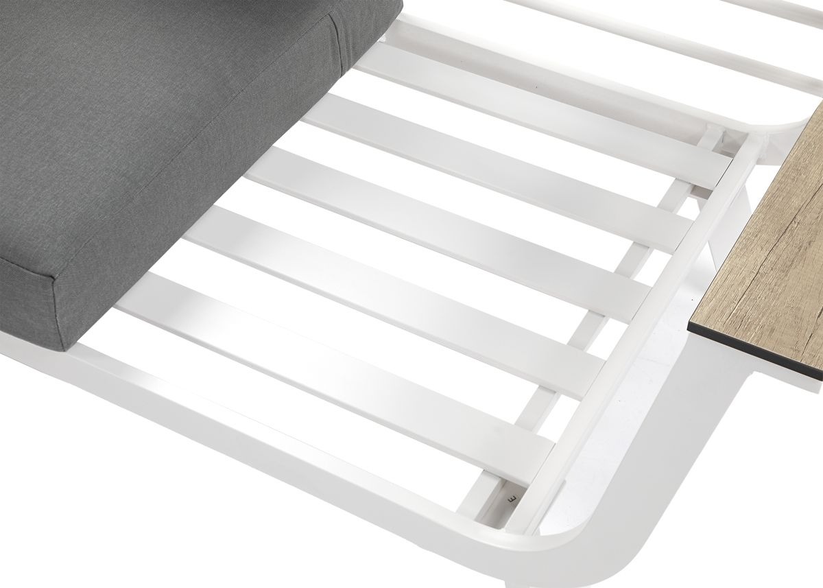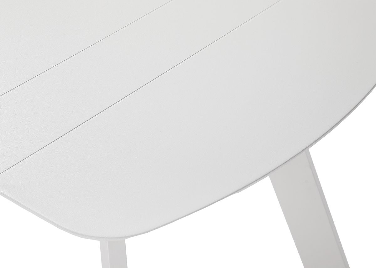 Stôl má biely hliníkový rám s práškovou povrchovou úpravou a vrchnú dosku z HPL, ktorá je odolná proti poškriabaniu, UV žiareniu a vlhkosti. Vďaka kompaktným rozmerom a stabilnej konštrukcii je ideálny na vonkajšie použitie.