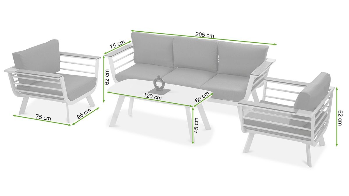 Sedacia súprava Aspen Caffe je štýlové a funkčné riešenie pre tých, ktorí si cenia pohodlie a modernú estetiku. Skladá sa z 3-miestnej pohovky, dvoch pohodlných kresiel a praktického konferenčného stolíka. Základom celku je ľahká, ale odolná hliníková konštrukcia, ktorá bola práškovo lakovaná bielou farbou. Ďalšie prvky vyrobené z HPL dosky imitujúcej drevo dodávajú nábytku elegantný charakter. Vankúše z odolného spriadaného polyesteru sú odolné voči vlhkosti a slnku, vďaka čomu je súprava ideálnou voľbou na terasu, balkón, záhradu alebo do komerčných priestorov.