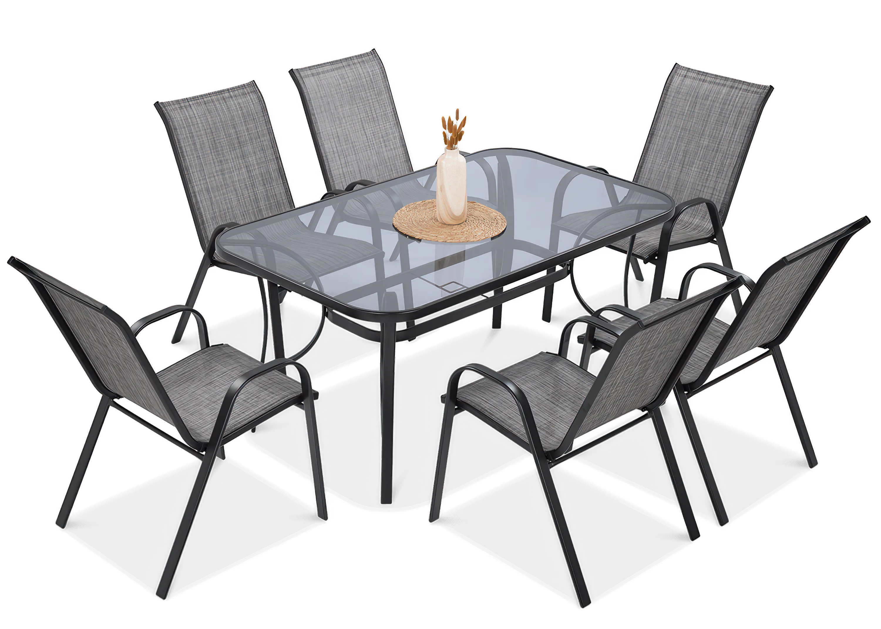Odporúčame vám zakúpiť si veľký a pohodlný záhradný set BOLOGNA. Súprava sa skladá zo 6 stoličiek a funkčného stola. Konštrukcia je vyrobená z ocele s práškovou povrchovou úpravou v antracitovom odtieni. Sedadlá sú potiahnuté odolnou textíliou Textilene na pohodlné používanie bez potreby vankúšov. Doska stola je vyrobená z tvrdeného elegantného dymového skla a má otvor na slnečník. Súprava sa veľmi ľahko čistí. Stoličky sú stohovateľné (skladajú sa jedna do druhej), čo šetrí miesto a uľahčuje ich skladovanie. Náš návrh je odpoveďou na cenovo dostupnú, peknú a praktickú súpravu do záhrady, na pozemok alebo terasu.