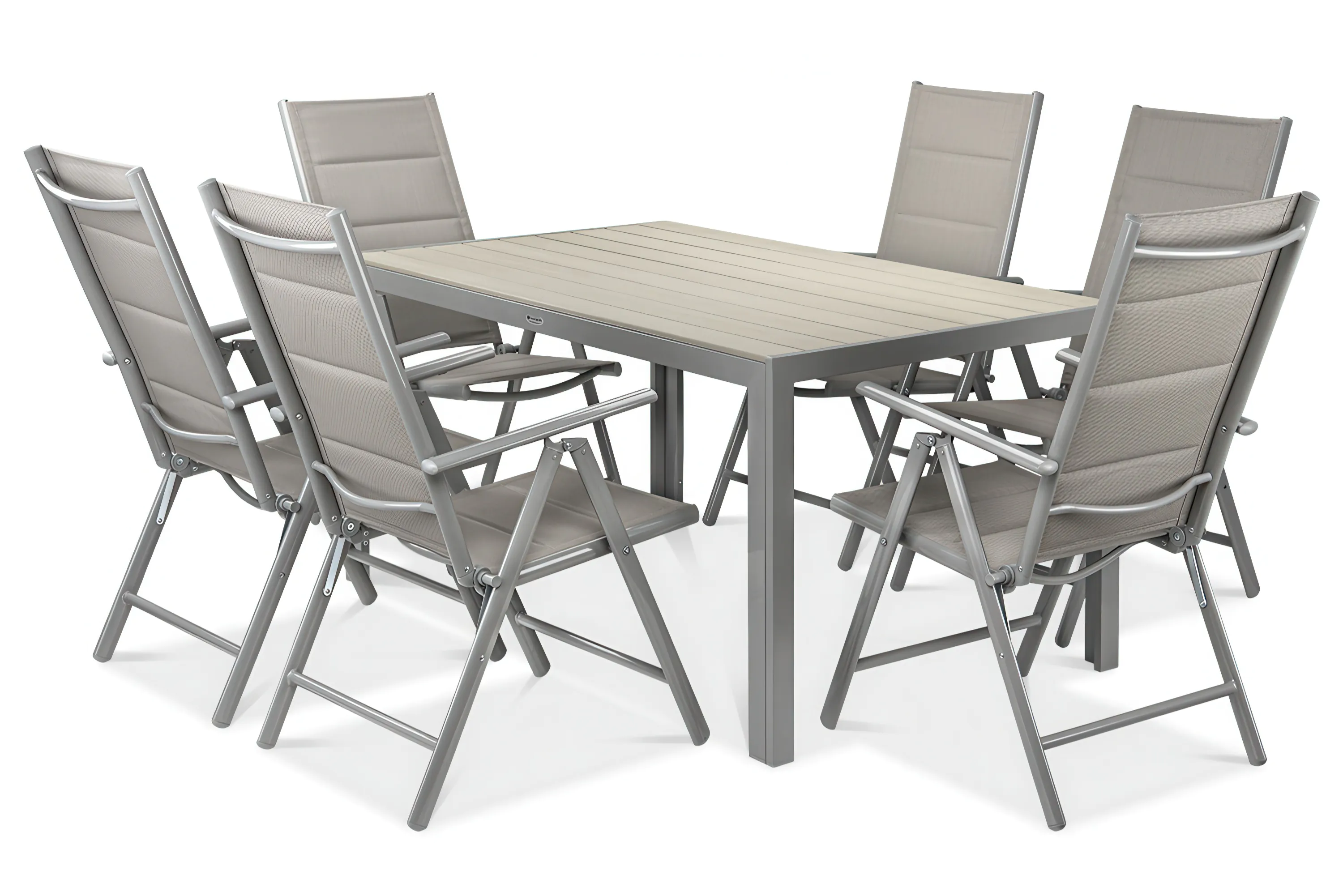 Záhradný nábytok Sydney vo farbe Silver/Taupe je jedným z najobľúbenejších jedálenských setov pre 6 osôb. Budete pohodlne stolovať (polohovateľné stoličky a veľký stôl) a popoludní si dať kávu s rodinou alebo priateľmi. Ďalšou výhodou prezentovanej súpravy je celohliníková konštrukcia, ktorá je maximálne odolná voči premenlivým poveternostným podmienkam. Súprava Sydney je záhradný nábytok navrhnutý s ohľadom na najnáročnejšieho zákazníka.