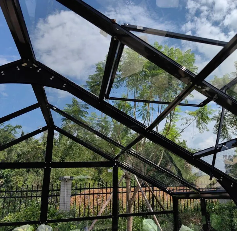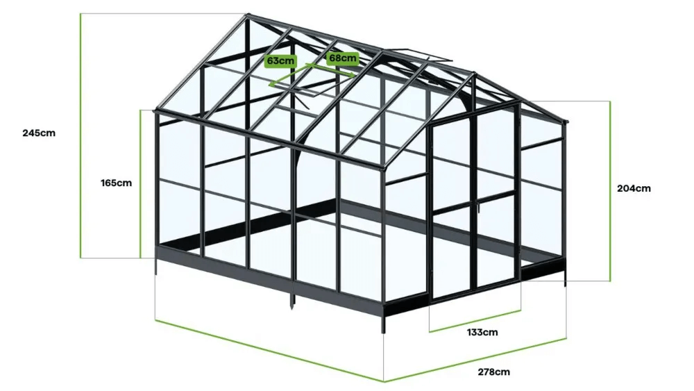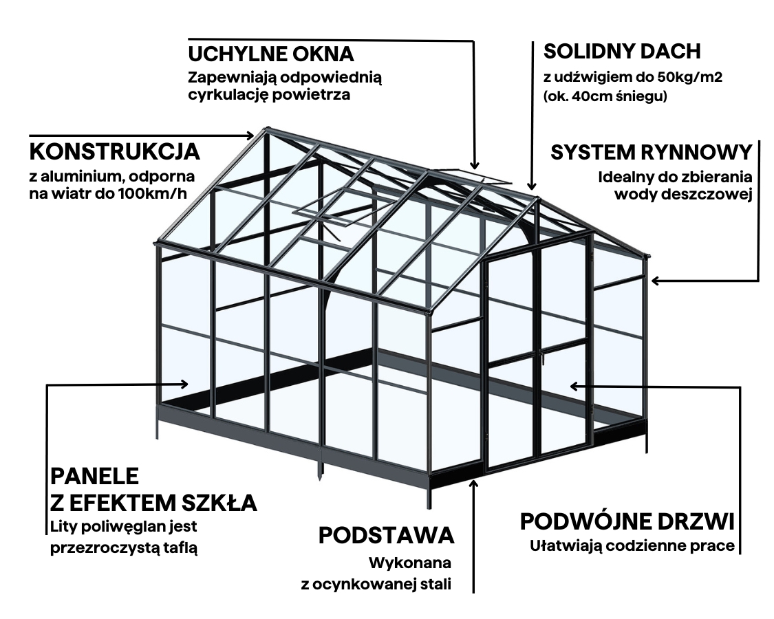 - Zasklenie je vyrobené z pevného polykarbonátu s hrúbkou 2 mm – materiálu, ktorý je odolný voči poveternostným vplyvom a zároveň poskytuje vynikajúcu priepustnosť svetla, čím vytvára ideálne podmienky pre rast rastlín. -