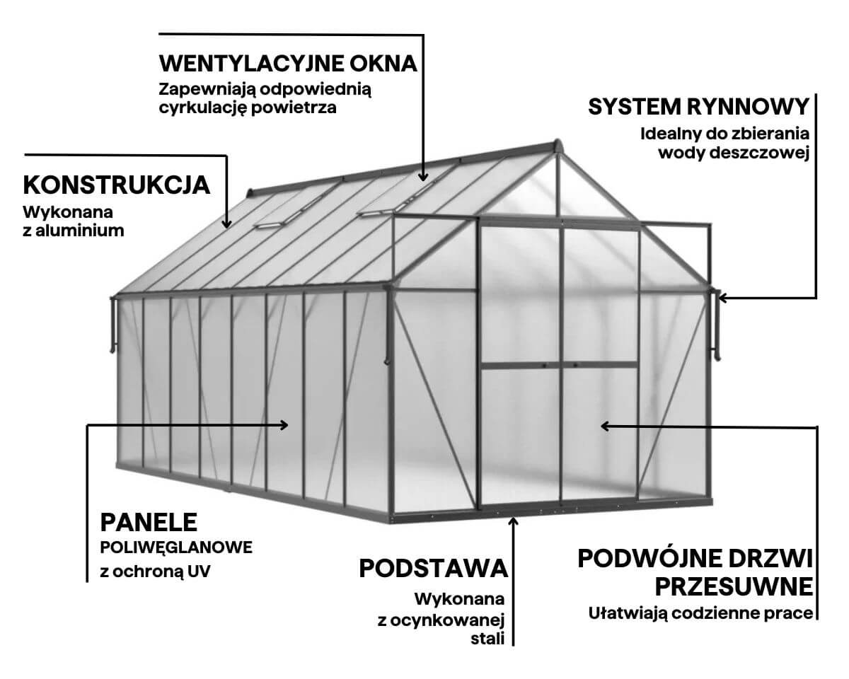 Použitie hlbokých, odolných hliníkových profilov posilňuje celú konštrukciu skleníka, čím sa zvyšuje jej odolnosť voči deformácii, zaťaženiu snehom a silnému vetru. Vďaka tomu je konštrukcia odolnejšia a zaručuje dlhodobé bezproblémové používanie aj v náročných poveternostných podmienkach.