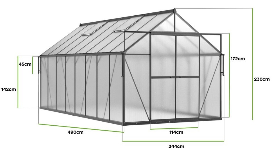 Polykarbonátový záhradný skleník Slide-In NEW 244x490cm Black od Cultivo s vystuženou konštrukciou je pokrokové riešenie pre záhradkárov, ktorí potrebujú priestor a spoľahlivú ochranu pre svoje plodiny. Vyniká elegantným čiernym dizajnom, vďaka čomu je nielen funkčný, ale aj štýlovým doplnkom záhrady. Jeho impozantné rozmery – dĺžka 490 cm, šírka 244 cm a výška 230 cm – zaručujú voľný pohyb a optimálne podmienky pre rastliny. Konštrukcia skleníka je založená na ráme z hliníkovej zliatiny a pozinkovanej oceľovej základni, čo zaručuje odolnosť a odolnosť voči rôznym poveternostným podmienkam. Dvojité polykarbonátové dosky s hrúbkou 6 mm s UV ochranou účinne izolujú interiér a chránia rastliny pred nadmerným žiarením a teplotnými výkyvmi. Vďaka inovatívnemu montážnemu systému Slide-In sa panely zasúvajú ľahko a bez použitia spôn, čo výrazne urýchľuje proces inštalácie a zvyšuje stabilitu konštrukcie. V skleníku sú inštalované dve dodatočné horizontálne priečky, ktoré posilňujú strechu a zvyšujú jej odolnosť voči zaťaženiu snehom a vetrom. Skleník je vybavený štyrmi vetracími oknami, ktoré podporujú prirodzenú cirkuláciu vzduchu, a širokými dvojitými posuvnými dverami pre pohodlný prístup aj s väčšími záhradnými náradím. Funkčnosť dopĺňa odkvapová rúrka na zachytávanie dažďovej vody a ekologické zavlažovanie plodín.