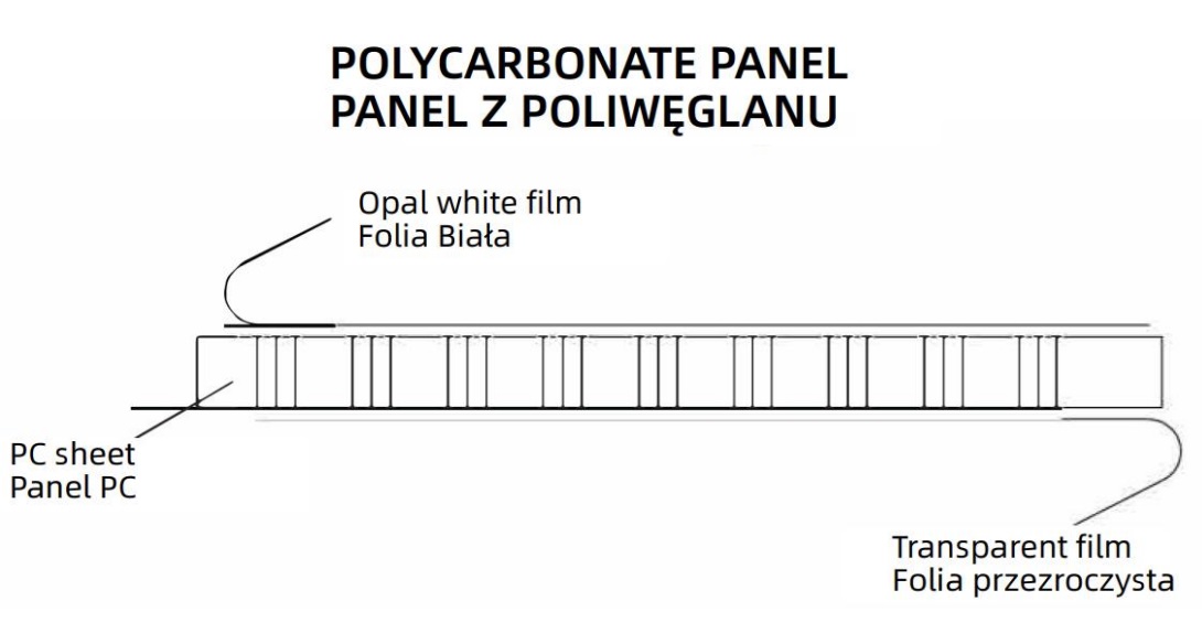 Polykarbonátové panely sú vybavené ochrannou fóliou, ktorá zabraňuje poškriabaniu počas prepravy. Pred inštaláciou je vhodné odstrániť približne 5 cm fólie z každej strany panelu, aby sa zabezpečilo presné uchytenie a jednoduchá inštalácia.