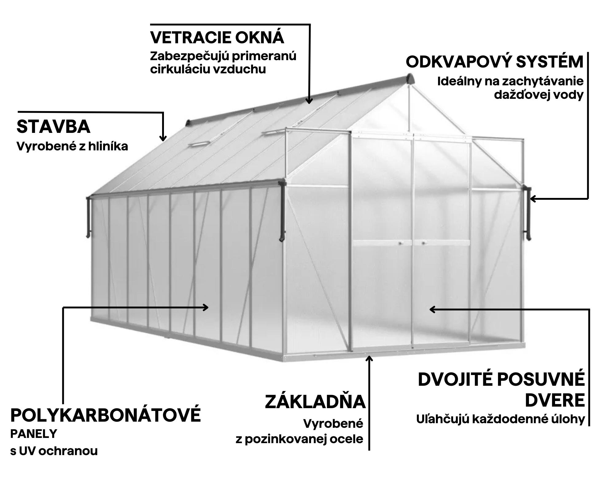 6 mm polykarbonátové panely v kombinácii s ochrannou fóliou zlepšujú tepelnú izoláciu a poskytujú rastlinám stabilné podmienky aj pri poklese teplôt. Špeciálna UV vrstva redukuje nadmerné slnečné žiarenie a chráni úrodu.
