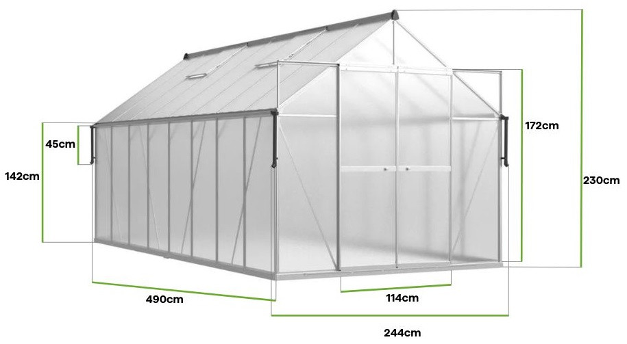 Doprajte svojej záhrade funkčnosť s záhradný skleníkom Slide-In NEW 244 x 490 cm Silver od Cultivo. Strieborná farba konštrukcie mu dodáva moderný vzhľad, ktorý sa perfektne hodí do klasických aj minimalistických priestorov. S dĺžkou 490 cm, šírkou 244 cm a výškou 230 cm poskytuje skleník dostatok priestoru na pestovanie rastlín, čo vám umožní realizovať aj tie najnáročnejšie záhradnícke projekty. Konštrukcia je založená na odolnom hliníkovom ráme a pozinkovanej oceľovej základni, čo zaručuje stabilitu a dlhú životnosť. Polykarbonátové panely s hrúbkou 6 mm, vybavené UV ochranou, chránia rastliny pred škodlivým slnečným žiarením a nepriaznivými poveternostnými podmienkami a zároveň zabezpečujú rovnomerné osvetlenie vnútri skleníka. Unikátny montážny systém „Slide-In“ uľahčuje inštaláciu – posuvné panely namiesto spôn sú rýchlym a mimoriadne stabilným riešením. Dvojité posuvné dvere so šírkou 114 cm uľahčujú vnášanie náradia a sadeníc a štyri vetracie okná umožňujú vynikajúcu cirkuláciu vzduchu, ktorá je nevyhnutná pre zdravý rast rastlín. Do skleníka boli pridané dve horizontálne priečniky, ktoré spevňujú konštrukciu strechy a zvyšujú jej odolnosť voči snehu a nárazom vetra. Skleník je tiež vybavený odkvapovými žľabmi, ktoré vám umožňujú zbierať dažďovú vodu a starať sa o svoje plodiny spôsobom šetrným k životnému prostrediu.