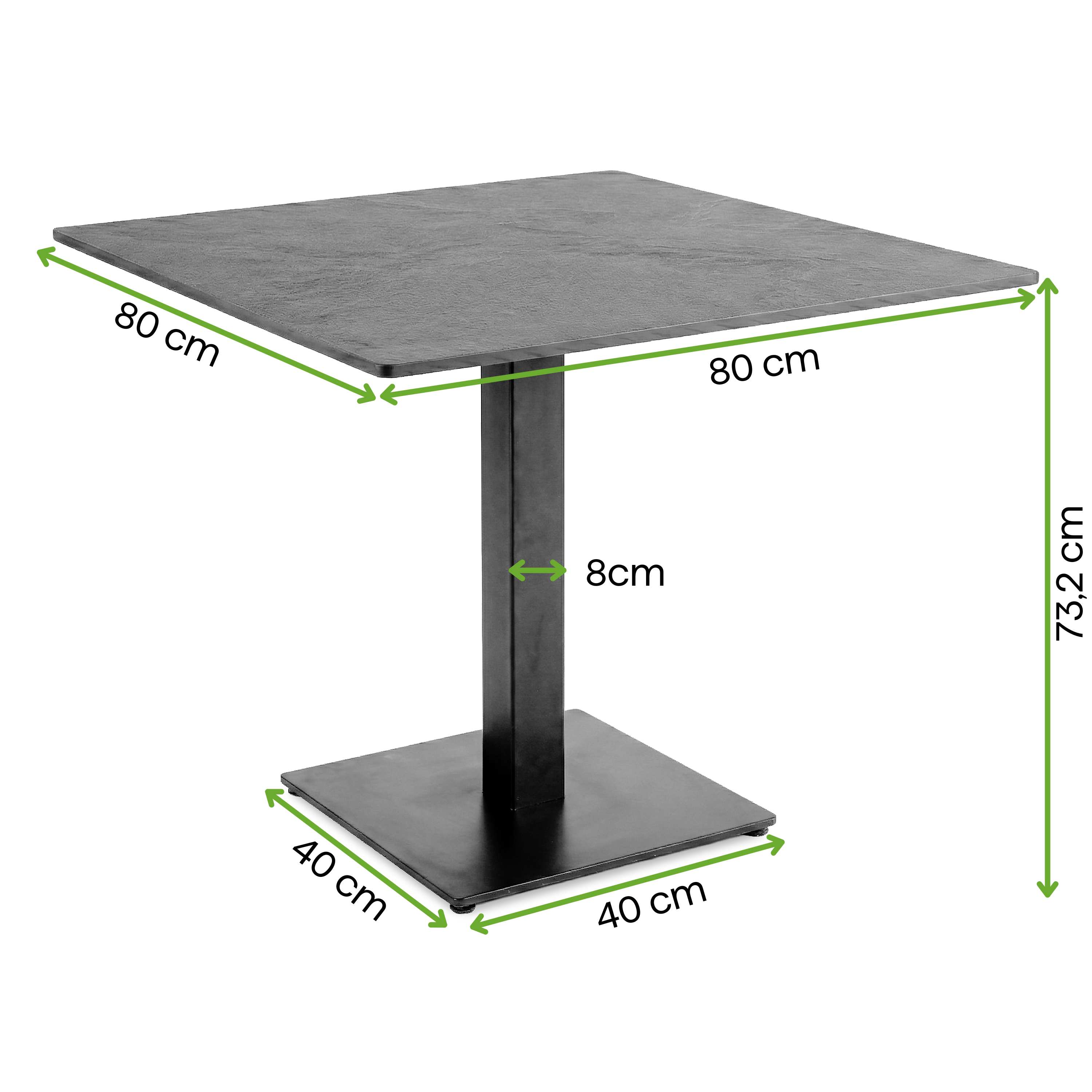 Záhradný stôl s oceľovou podnožou RIVIO/VENA 80 cm - Bjørkka spája moderný tvar, odolnosť a materiály určené na intenzívne používanie v exteriéri. Robustná podnož RIVIO BLACK vyrobená z hrubej ocele, chránená elektroforetickou povrchovou úpravou v pieskovo čiernej farbe, poskytuje vysokú odolnosť proti poveternostným vplyvom a korózii a bezpečnú oporu pre dosku stola s nosnosťou až 25 kg. Dopĺňa ju doska VENA 80 ANTHRACITE MARBLE z kompaktného laminátu HPL, ktorá sa vyznačuje odolnosťou proti poškriabaniu, nárazom, oderu, vlhkosti a UV žiareniu, pričom si dlhodobo zachováva hĺbku farby antracitového mramoru. Celok vytvára estetický stôl s jednoduchou údržbou, ideálny do záhrad, na terasy a do komerčných priestorov, ako sú reštaurácie, školy alebo verejné zariadenia.